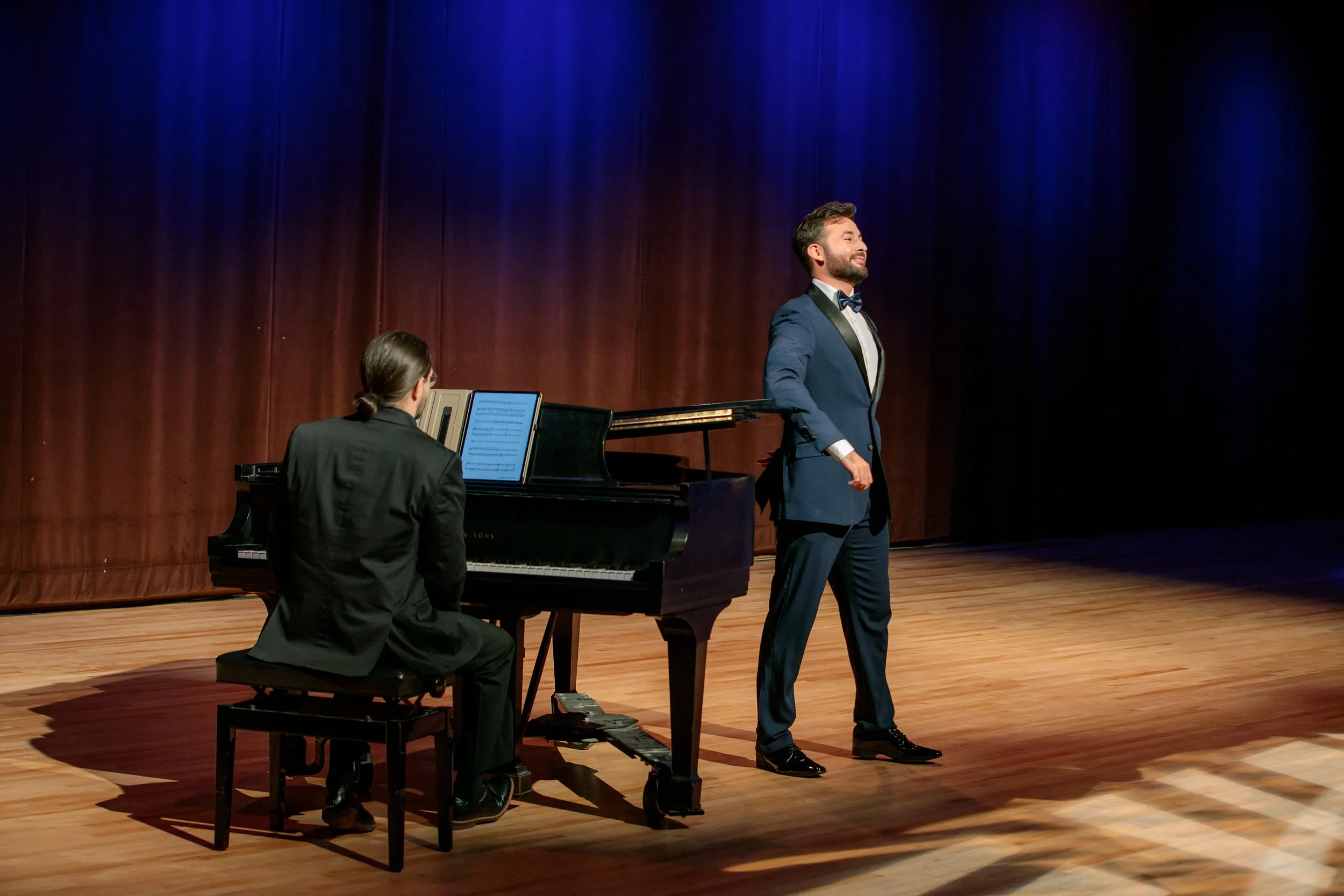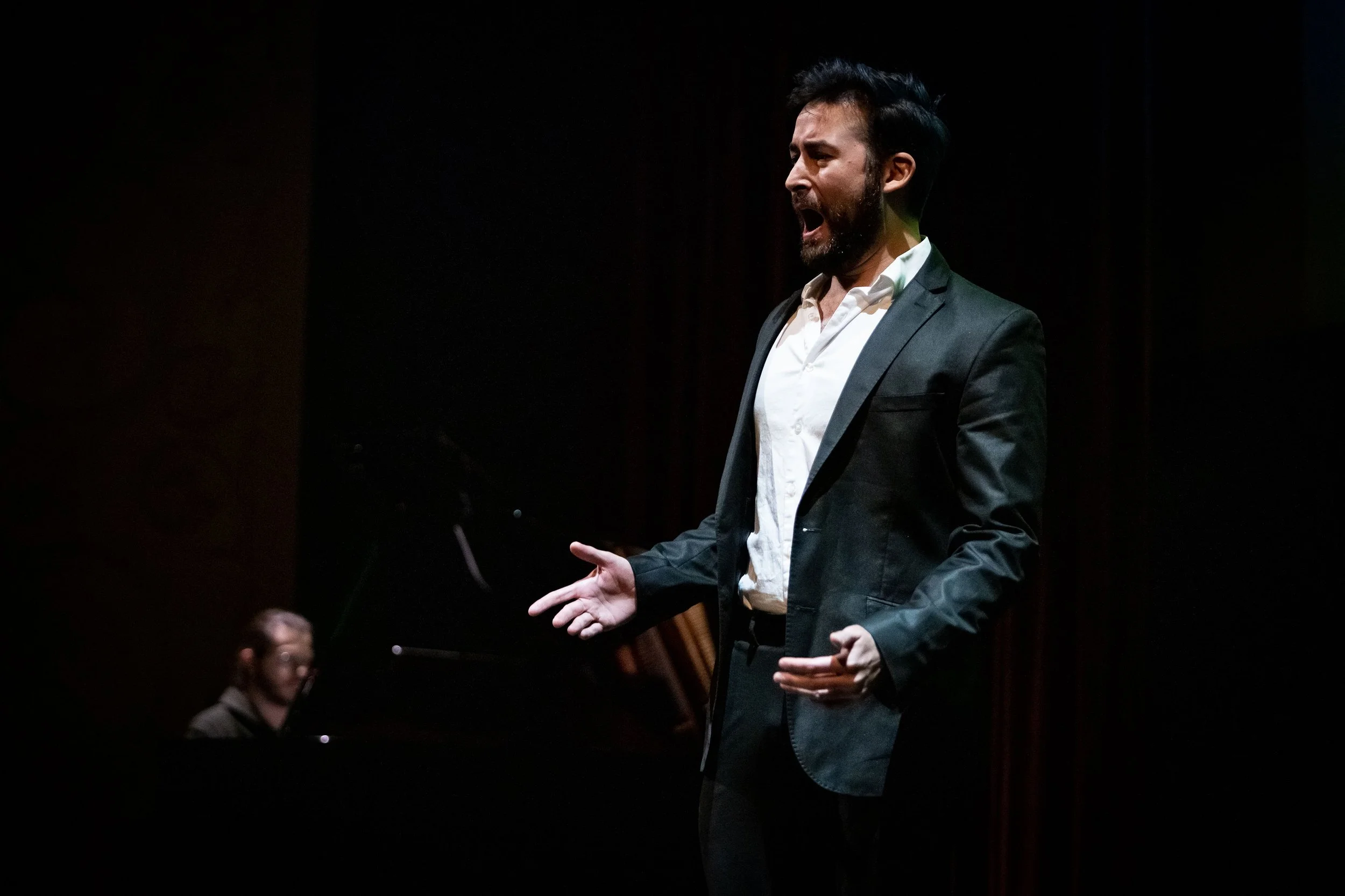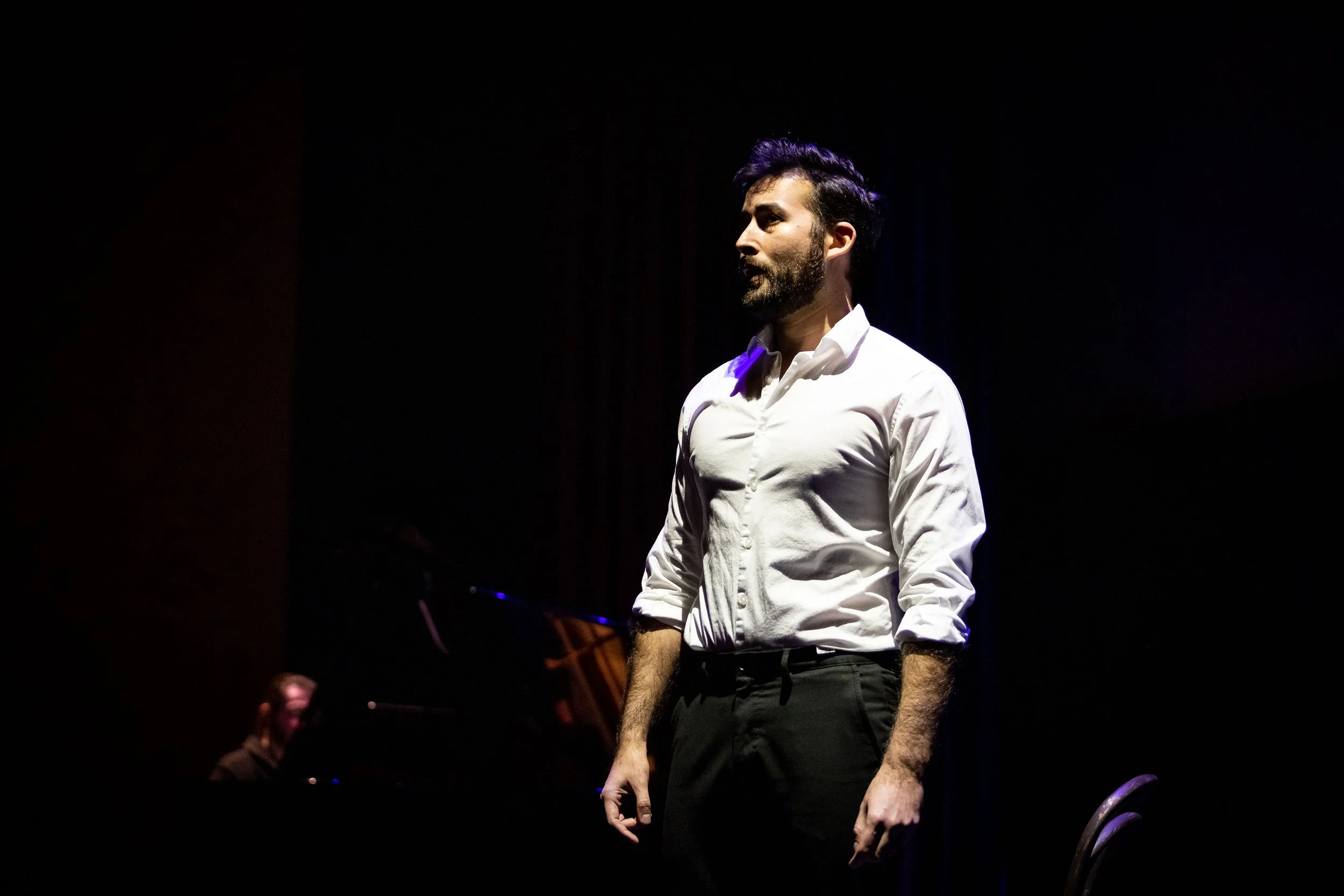 A man with a beard and dark hair stands on stage in front of a dark background, illuminated by stage lighting, with a woman playing piano in the background.