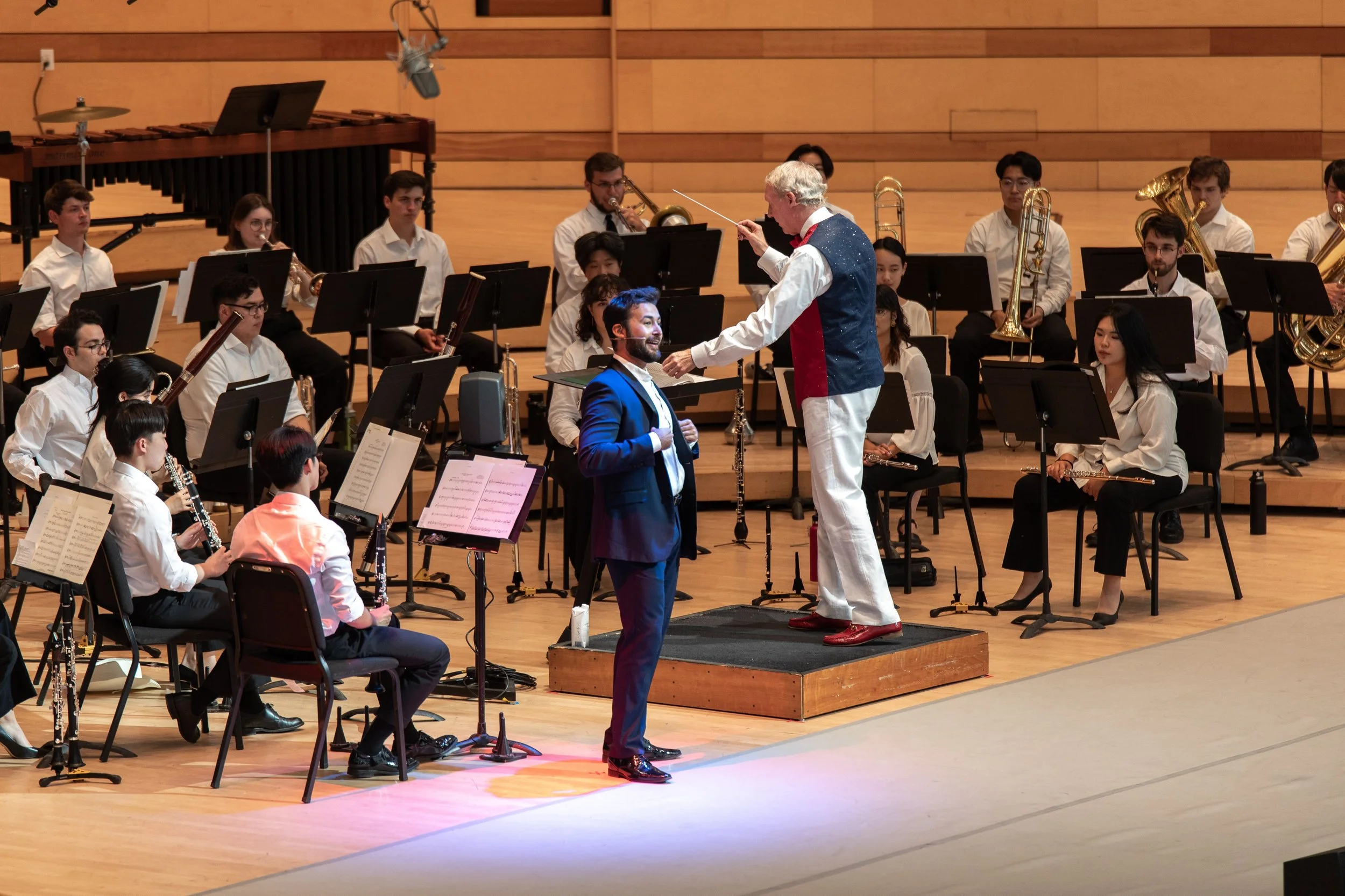 A man in a tuxedo with a bow tie is performing on stage with a dark background.