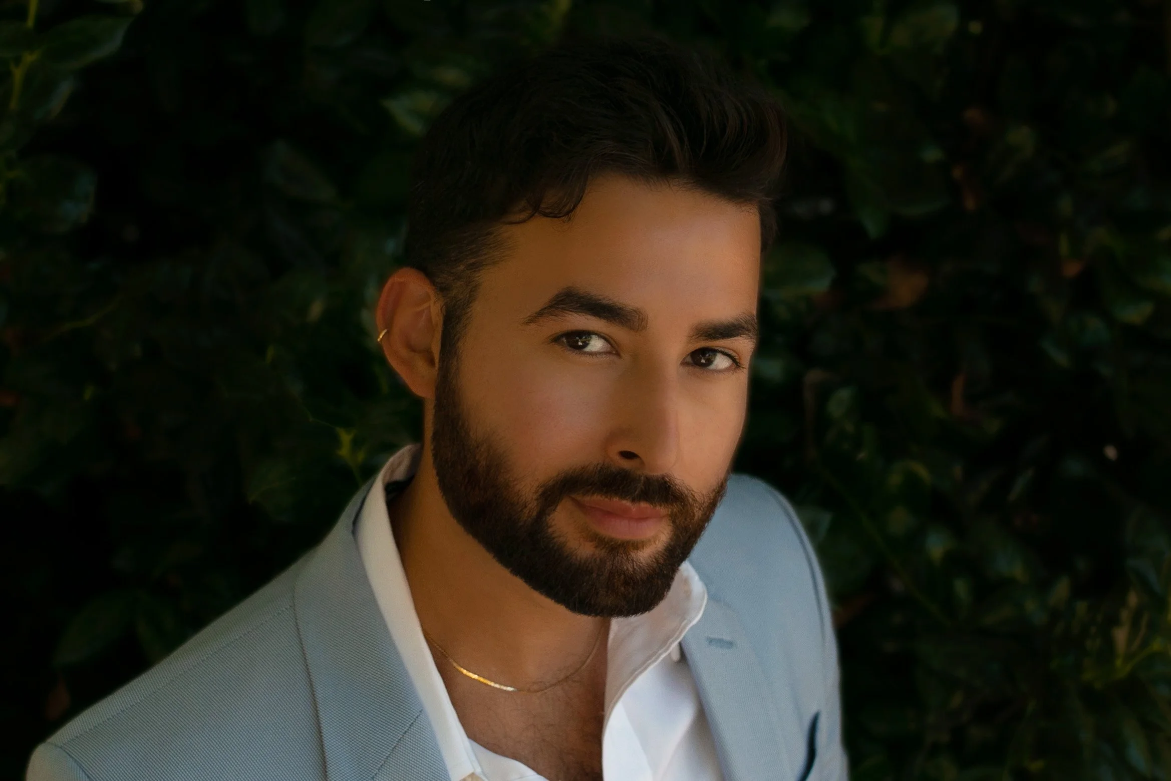 Dante Mireles Headshot wearing a light gray suit, white shirt, and gold necklace, looking into the camera with a serious expression, standing in front of dark green foliage.