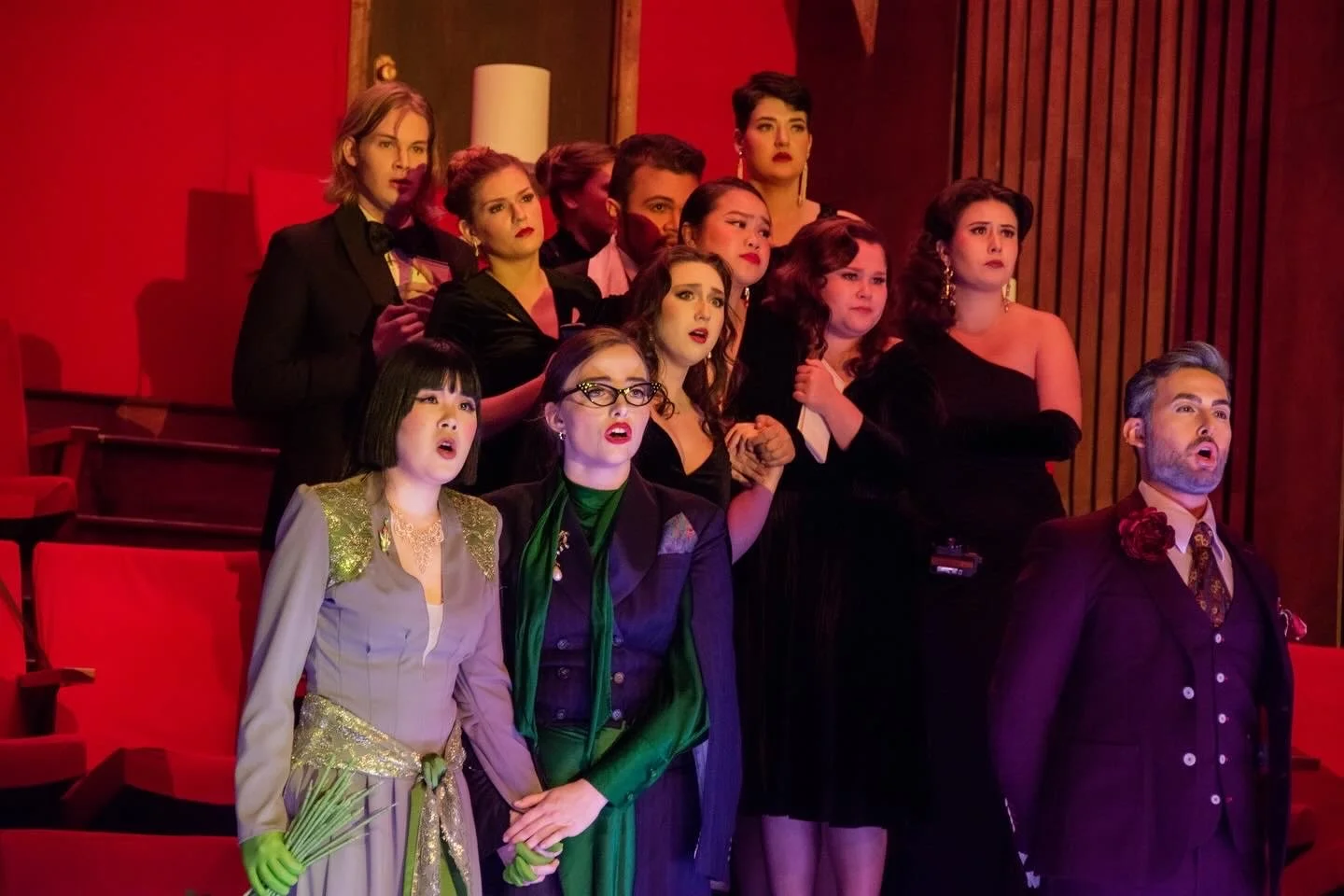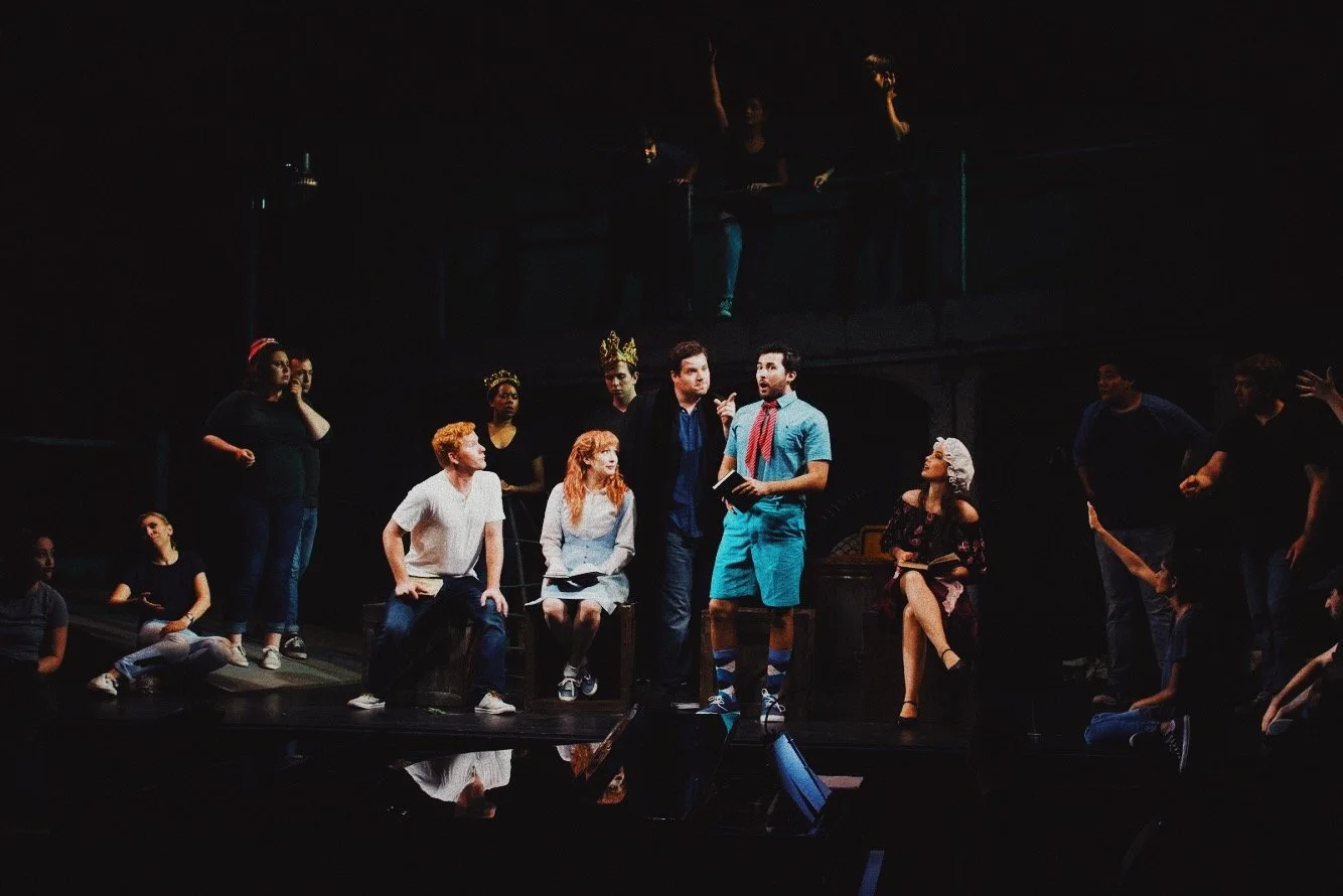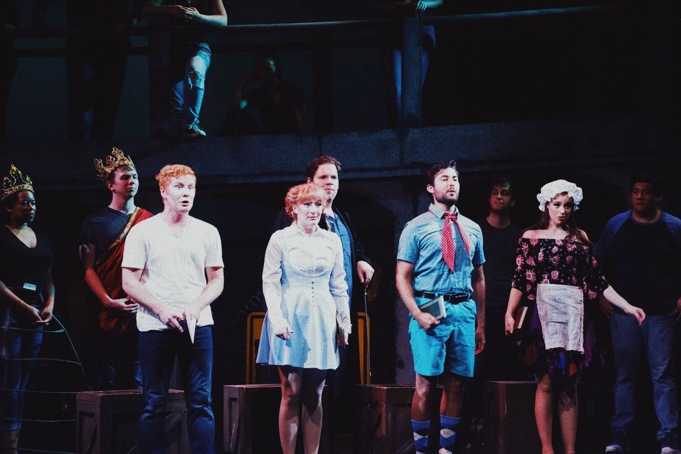 The cast of a theatrical play on stage, including people dressed as royalty, a girl in a nurse's outfit, and individuals in casual clothing, with some holding books. Candide by Leonard Bernstein at Seagle Music Festival Dante Mireles