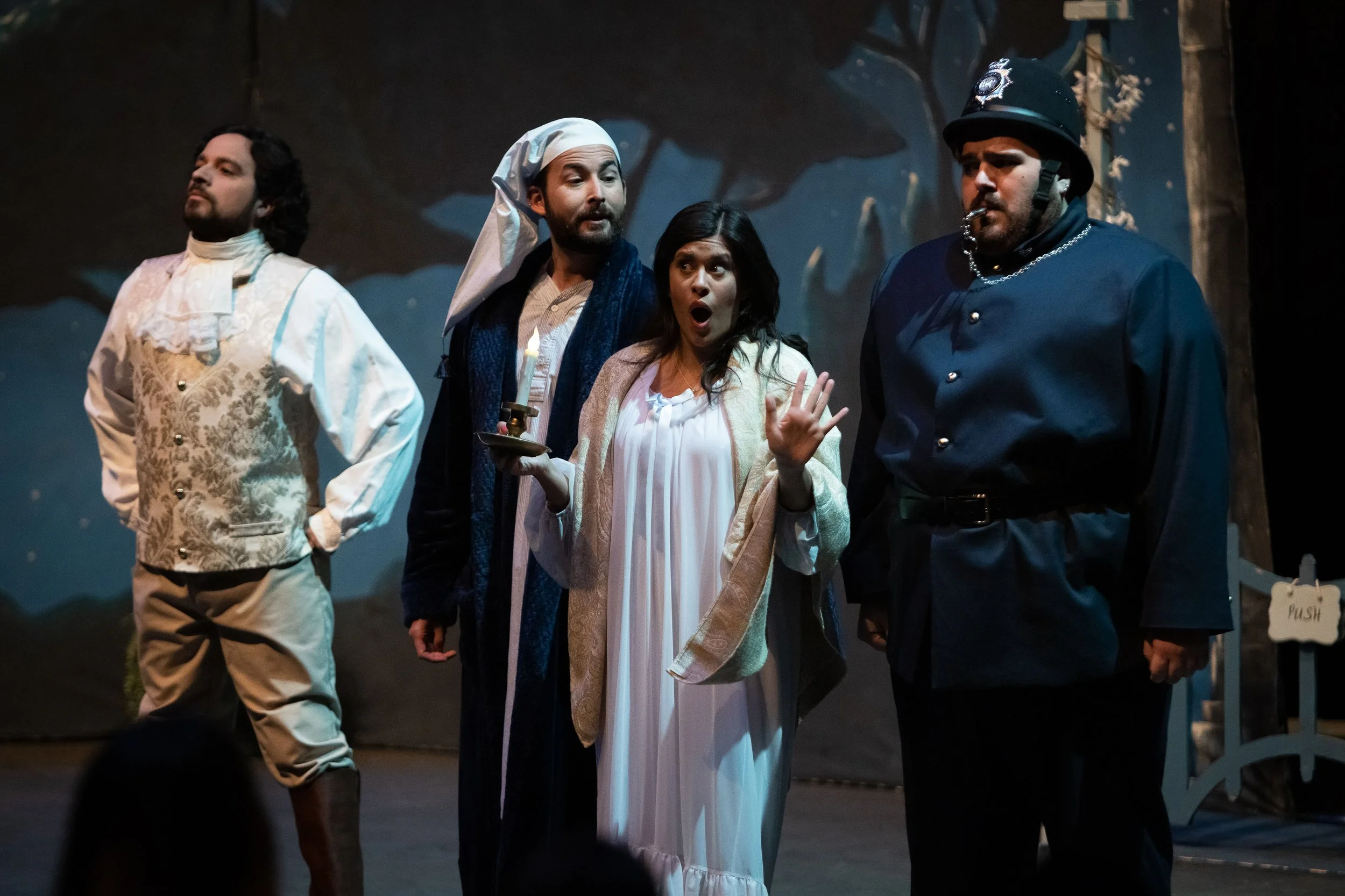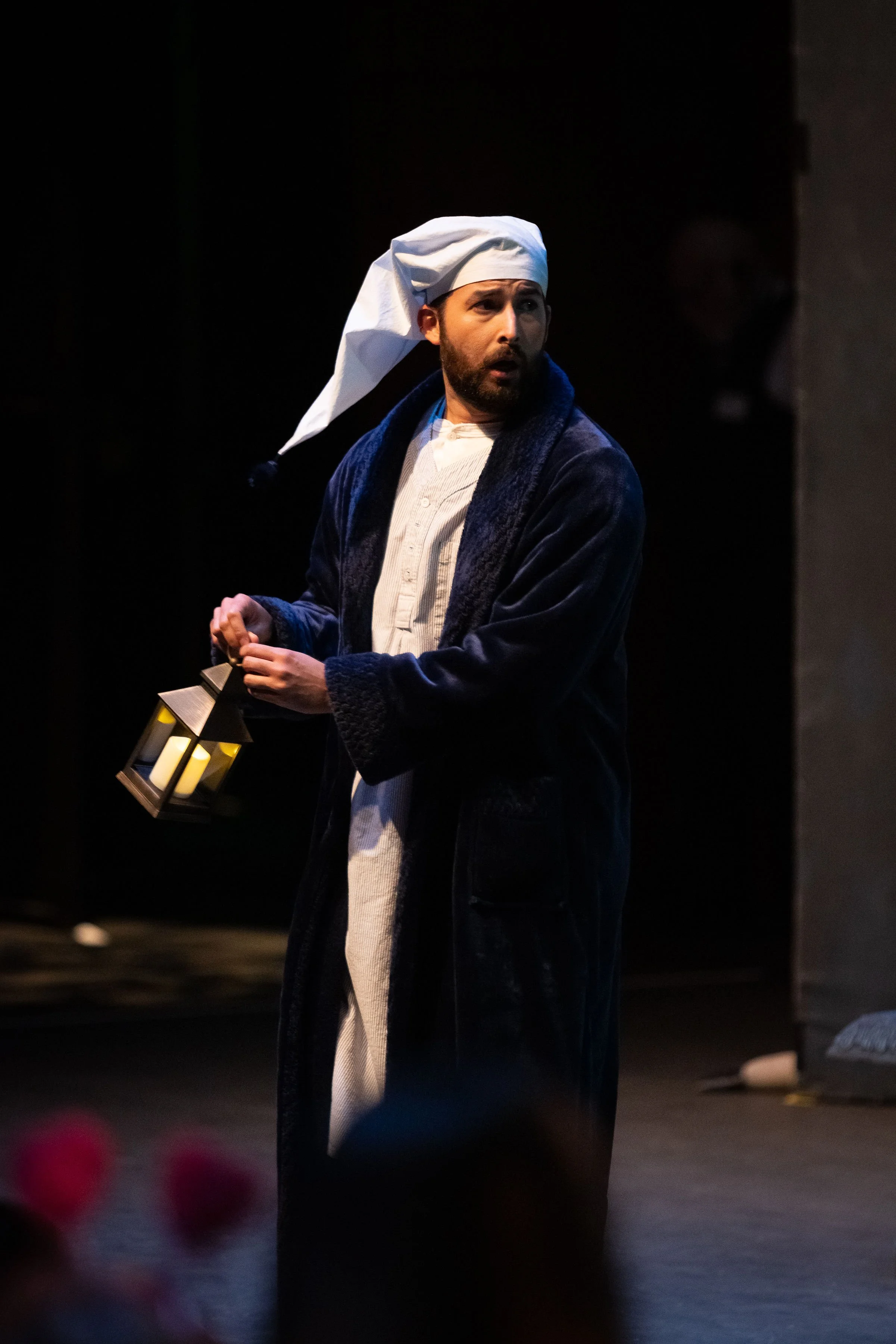Dante Mireles as Modern Major General Outreach show for Opera Colorado, wearing a white nightcap and a long dark robe, holding a lantern and standing on stage during a theatrical performance.
