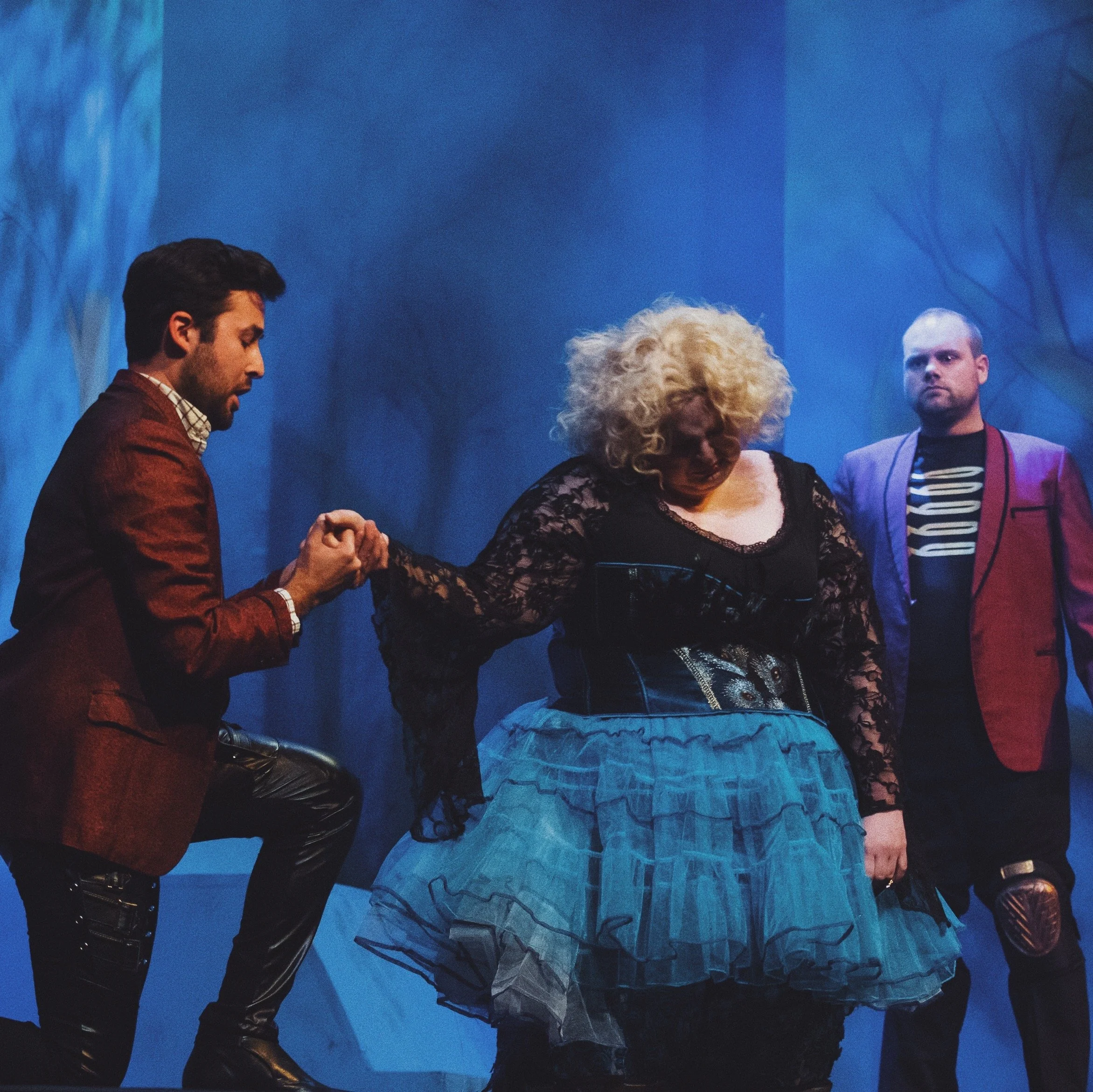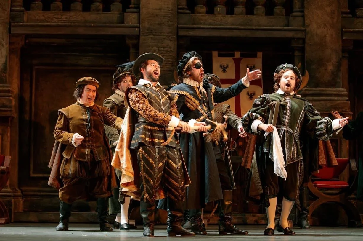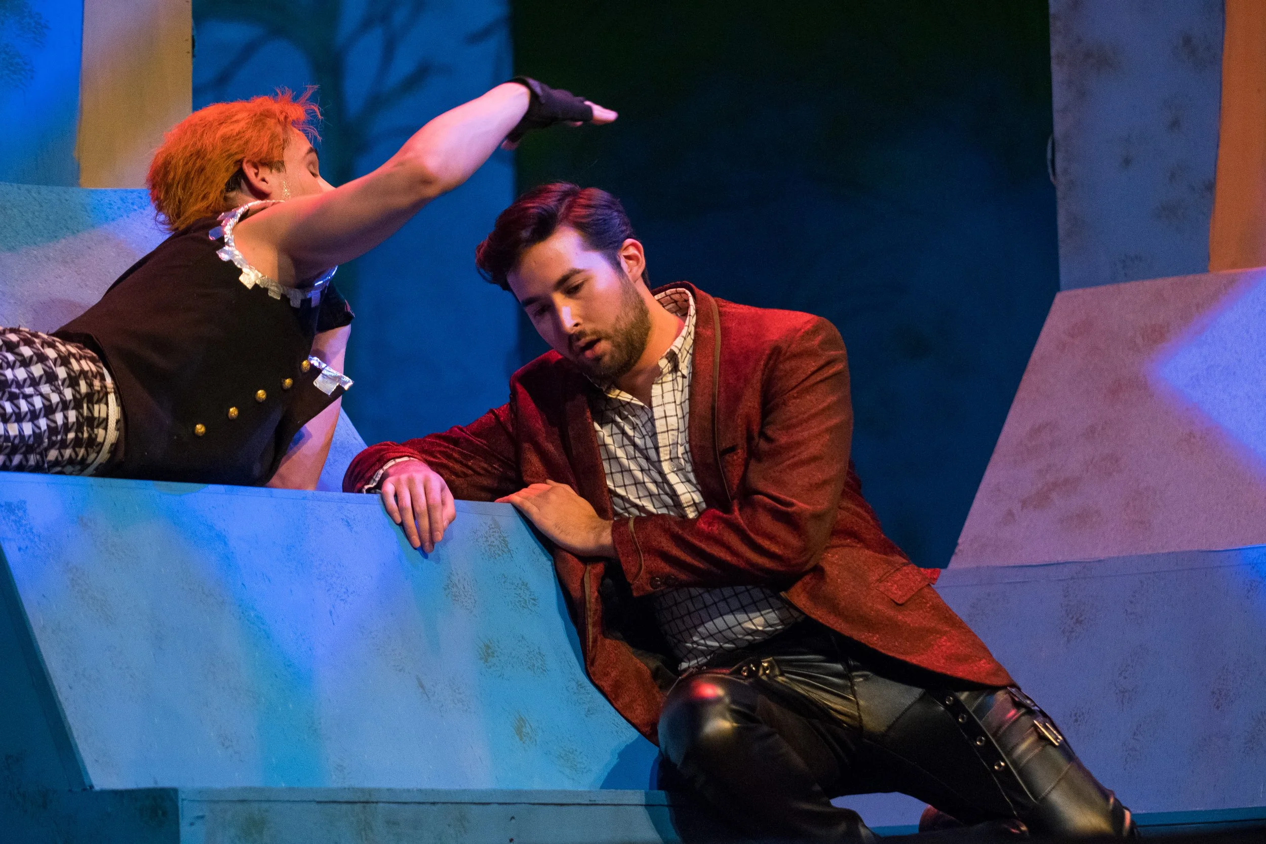 Actors performing in a theatrical play dressed in Renaissance costumes, appearing to sing or speak passionately on stage. Dante Mireles as Marullo in at Opera Colorado's production of RIgoletto .