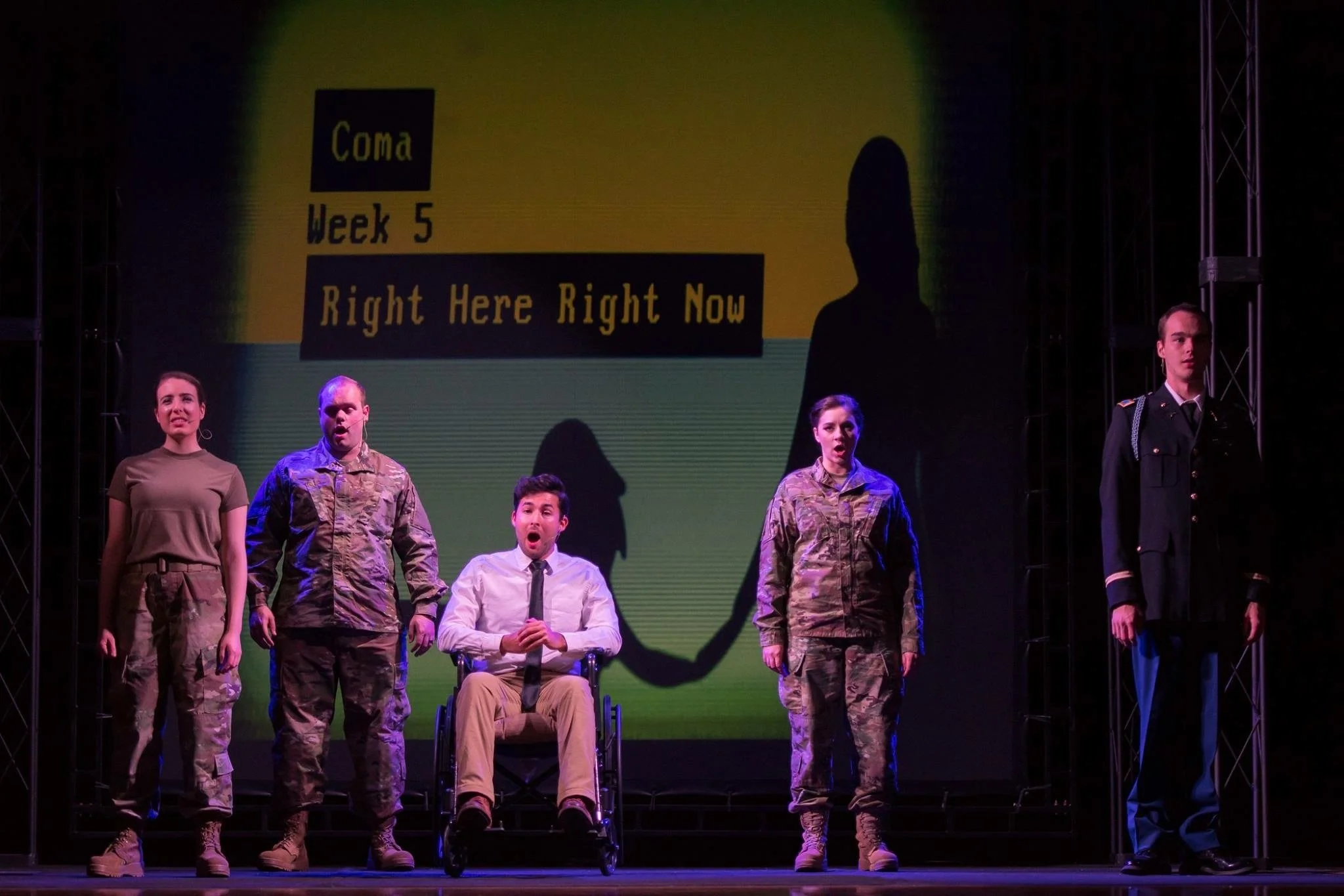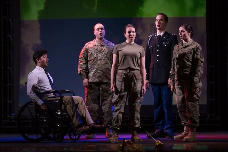 Five performers, including a person in a wheelchair, singing on stage during a theatrical production. Premier of Falling and the Rising. Dante Mireles  at Texas Christian University Opera Studio