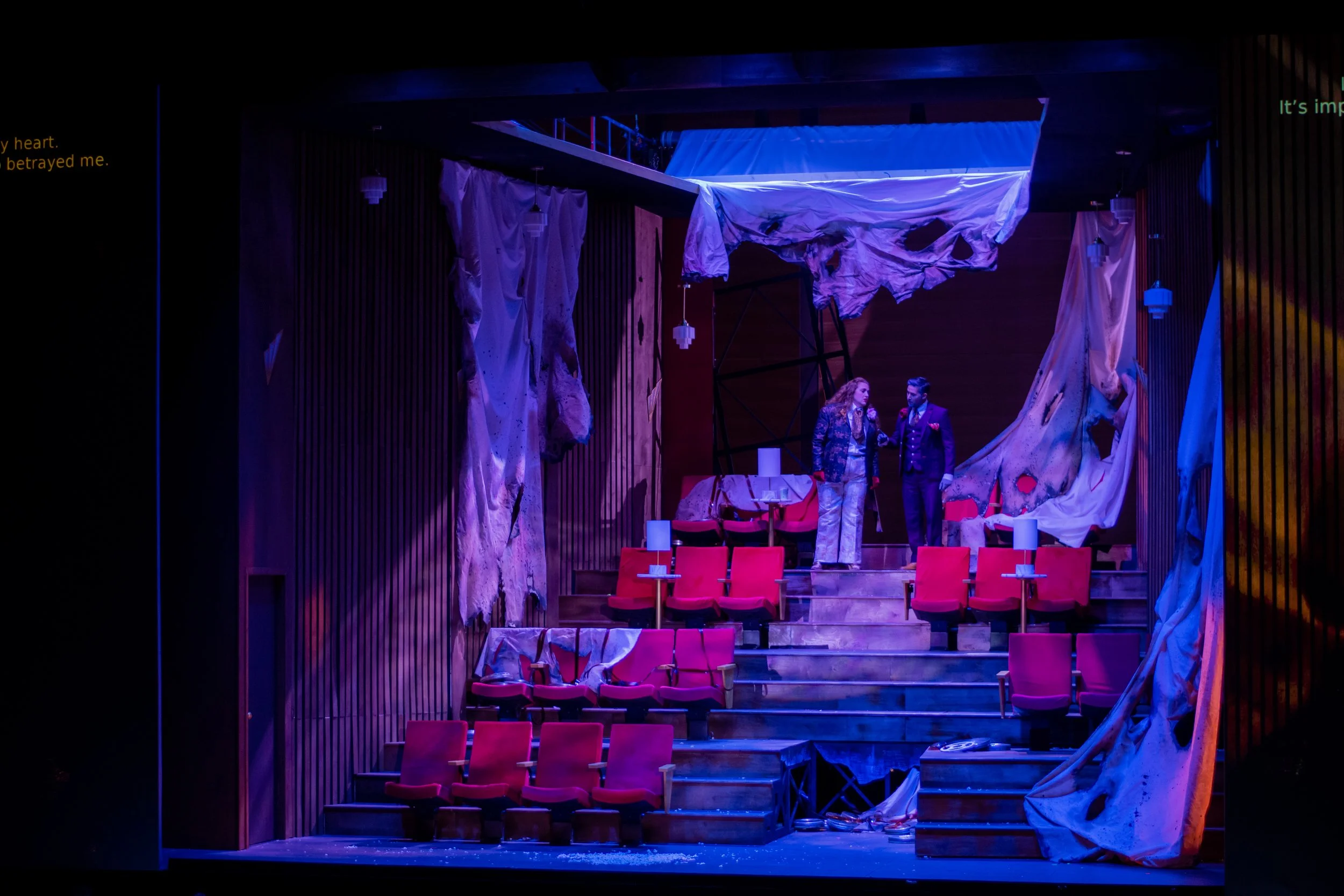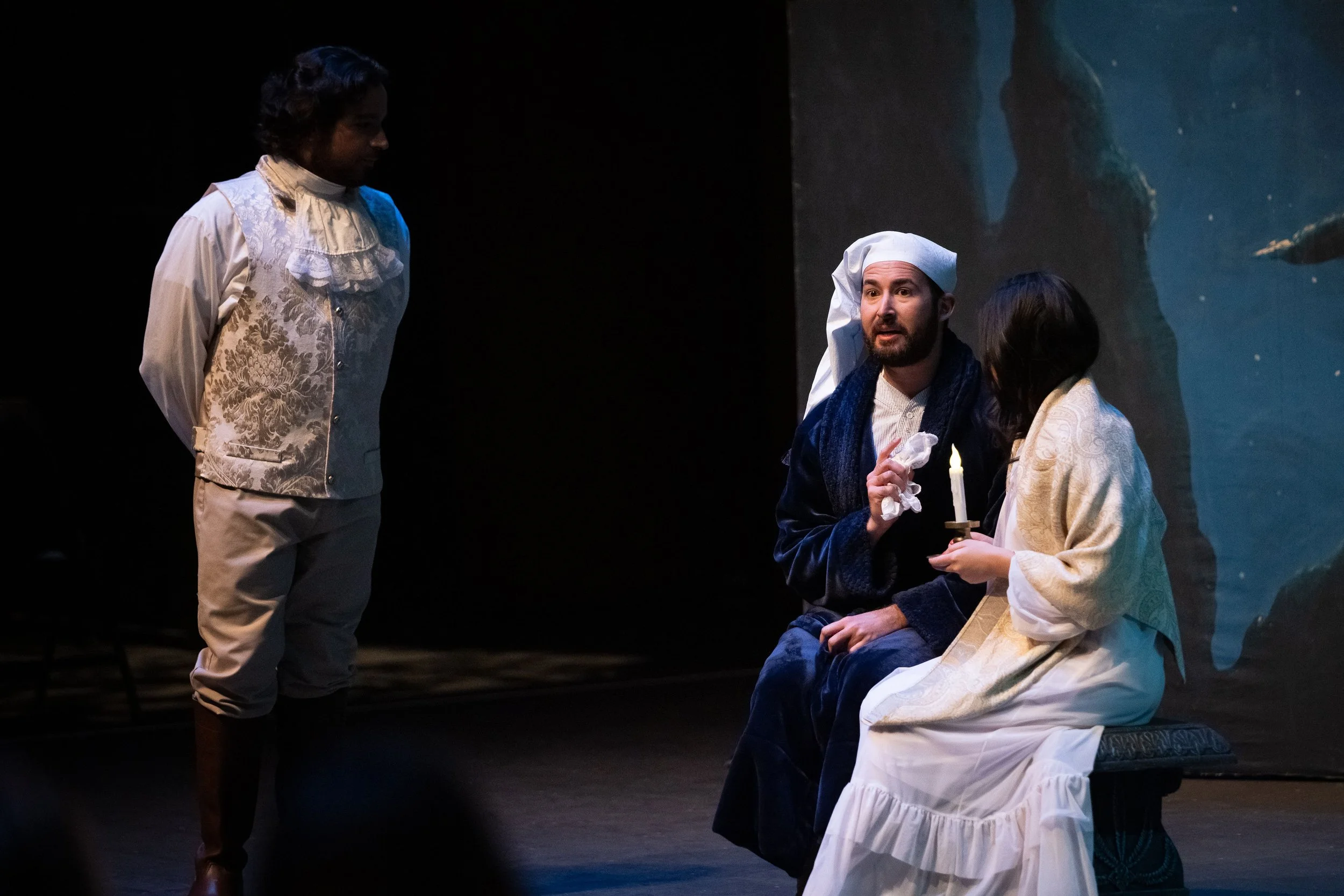 Three actors performing a scene on stage, with one standing on the left and two sitting on the right, one holding a candle, and a painted background depicting a night scene.