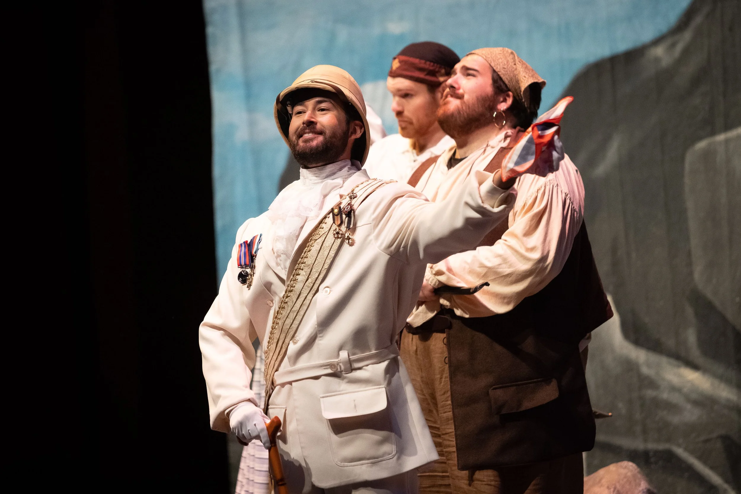Three men dressed in historical costumes on stage, with one at the front smiling and gesturing outward, wearing a light-colored jacket with medals and a pith helmet, while the other two stand behind him.