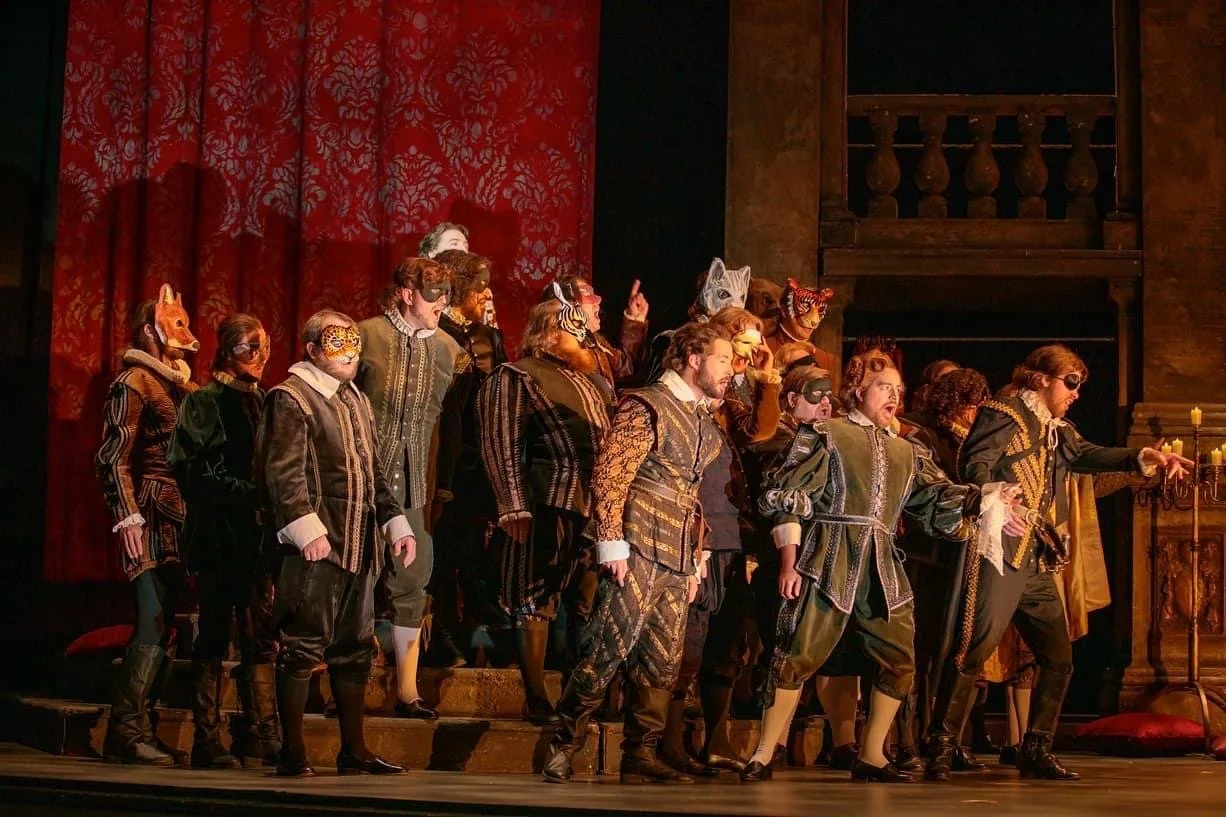 A theatrical stage performance featuring actors in period costumes and animal masks, performing a scene in a historic or fantasy setting. Dante Mireles as Marullo in at Opera Colorado's production of RIgoletto .