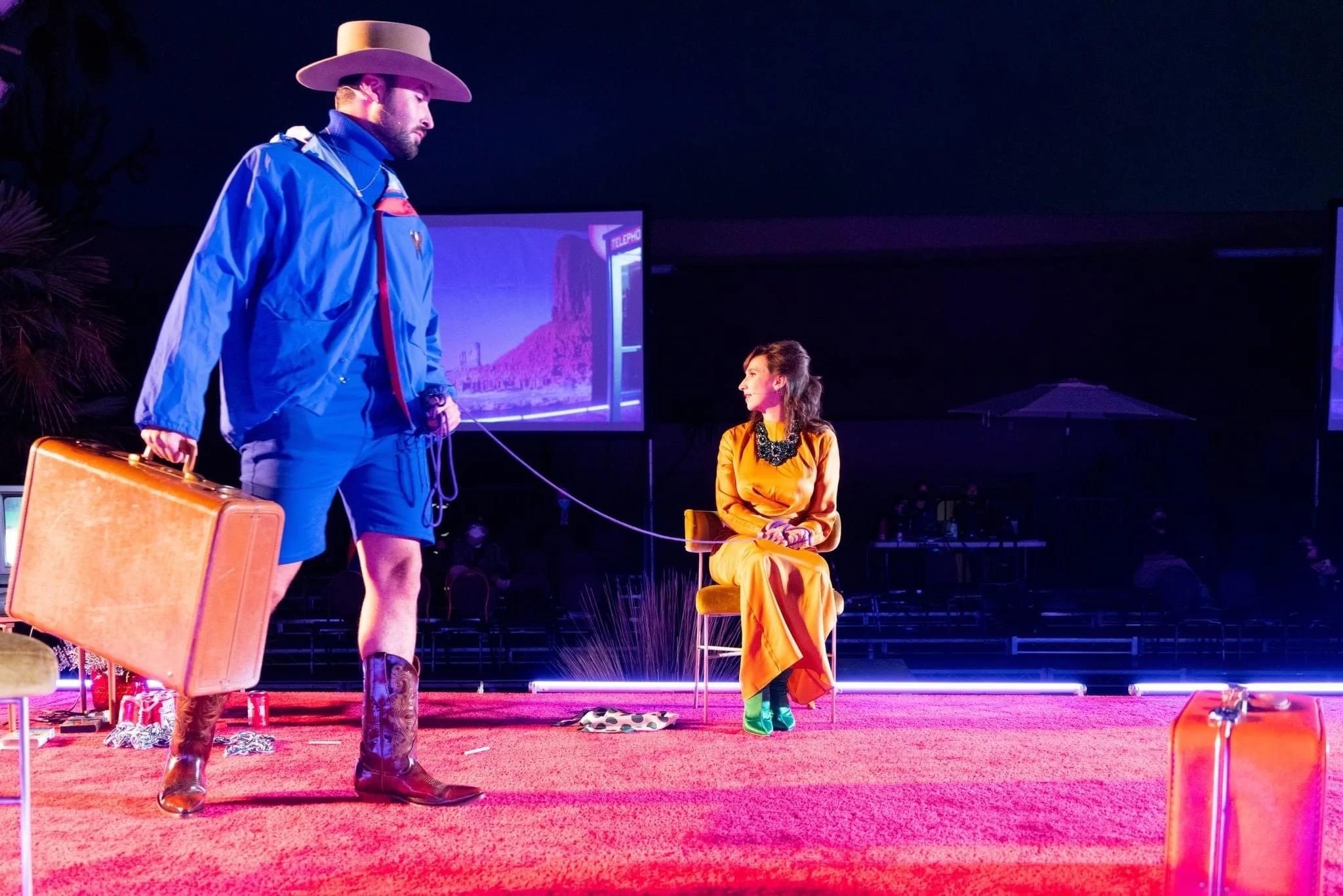 A theatrical scene with a man dressed as a military officer in a white uniform with medals, wearing a pith helmet, talking to a woman in vintage dress holding an umbrella, in a dark setting. Dante Mireles as Modern Major General at Opera Colorado