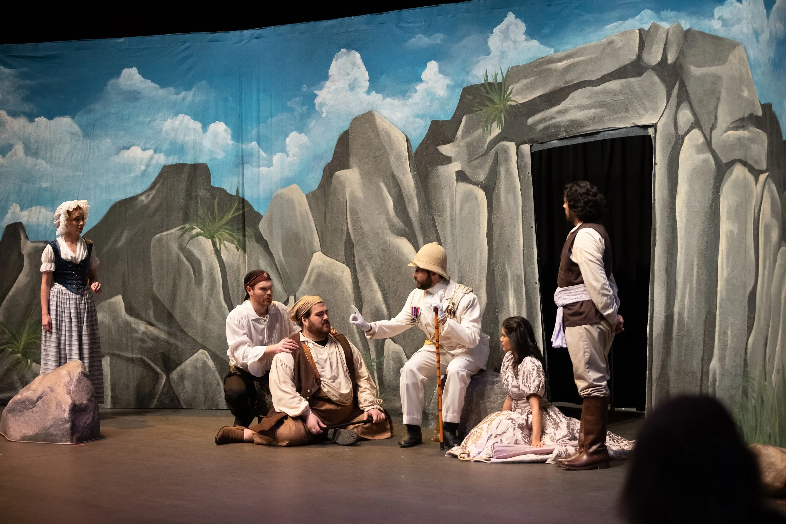 The image shows a theatrical performance with actors in period costumes on a stage with a mountain landscape backdrop.